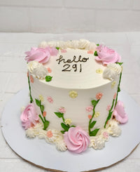 A whimsical pastel cake featuring white frosting, pink and white rosettes, and piped garden-style flowers in soft yellow, pink, and orange. Green vines wrap around the sides, and the handwritten message “hello 291” adds a playful, poetic touch. Ideal for aesthetic birthdays, milestone celebrations, or personalized gifting.