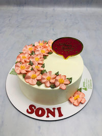 This elegant cake features delicate peach-colored flowers atop a classic white base. Perfect for weddings, birthdays, or any special occasion, this stunning cake adds a touch of sophistication to any event. The flowers are carefully crafted to add a subtle pop of color and enhance the overall aesthetic of the cake. Elevate your celebration with this beautiful and delicious centerpiece.