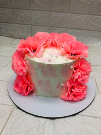 Celebrate with grace through this beautifully decorated birthday cake featuring a smooth white base and vibrant pink buttercream flowers arranged around the top and sides. Scattered white edible pearls add texture and sophistication, while the floral placement creates a striking visual bloom. Presented on a clean white board against a tiled backdrop, this cake blends sculpted artistry with minimalist elegance—perfect for birthday gifting, adult uploads, or catalog entries that highlight beauty, warmth, and emotional finesse.