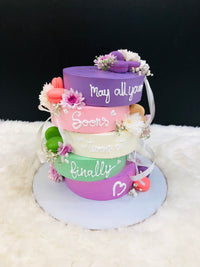 Celebrate transformation and tenderness with this artistic four-tier cake featuring tilted pastel layers in lavender, pink, green, and purple. Each tier carries part of a heartfelt message in white cursive: “May all your soon’s turn into finally,” anchoring the tribute with hope and affirmation. The cake is adorned with fresh flowers, pink macarons, and white ribbons, adding softness and elegance. Presented on a white circular board against a fluffy base and black backdrop, this cake blends poetic storytelling with sculpted finesse—perfect for milestone gifting, affirmation uploads, or catalog entries that highlight emotional depth, visual charm, and whimsical grace.