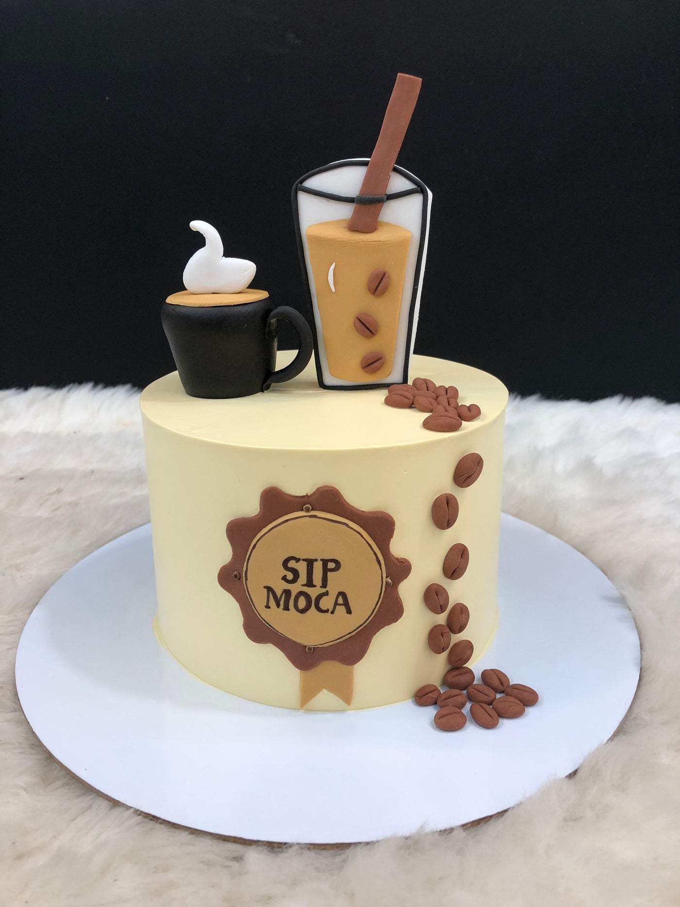 Brewed for coffee enthusiasts, this beige fondant cake is topped with a latte swirl, iced coffee glass, and scattered fondant beans. The “Sip Moca” badge adds a custom touch, making it ideal for café-themed parties, birthdays, or brand events. Rich in detail and flavor, it’s a tribute to every sip that sparks joy.