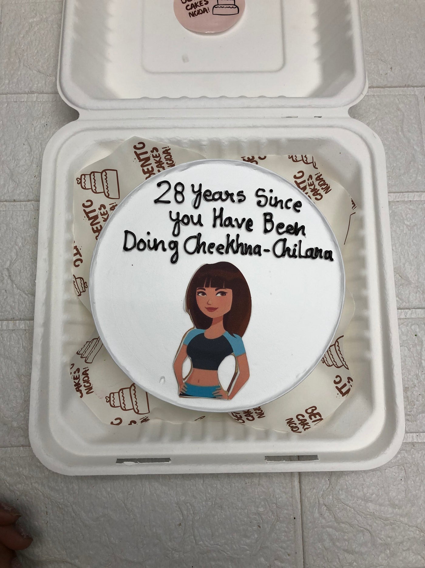 Celebrate 28 years of unapologetic volume with this cheeky bento cake featuring a smooth white frosting base and a cartoon-style illustration of a woman in a blue and black crop top and pants. The bold message “28 Years Since You Have Been Doing Cheekhna-Chilana” is piped in black icing above the figure—blending humor, personality, and playful teasing. Presented in a white takeout-style container with branded liner, this cake is perfect for gifting someone who’s loud, proud, and full of life. Ideal for milestone birthdays, roast-style drops, or uploads that highlight sass, identity, and celebration.