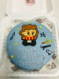 Celebrate Vanshuuuu’s birthday with this enchanting Harry Potter-themed bento cake featuring a cartoon-style Hermione Granger holding a book, surrounded by magical elements: a wand emitting light, round glasses, a white owl, golden stars, and the iconic “9 ¾” symbol. The message “Happy Birthday Vanshuuuu” is written in black icing on a soft blue base, making this cake perfect for Potter fans, themed parties, or whimsical gifting with a personalized twist.