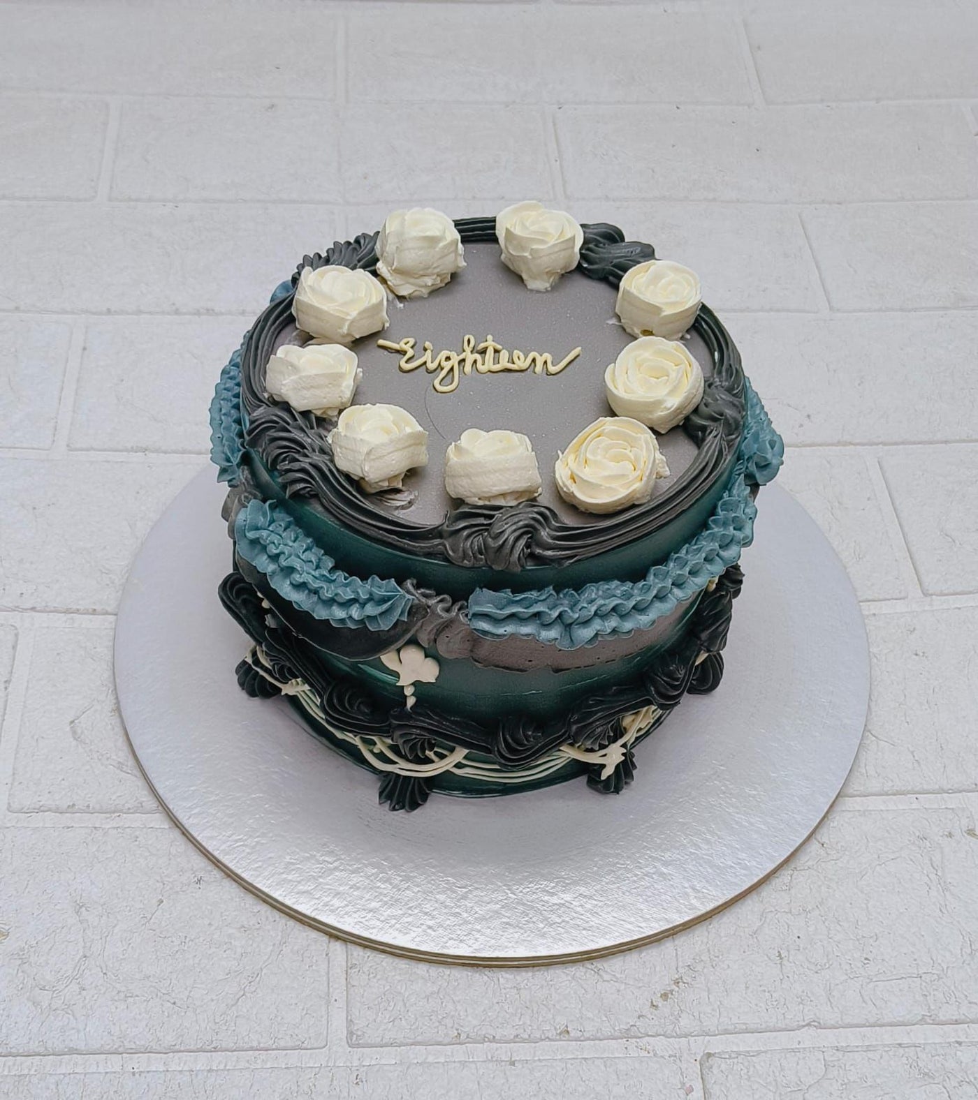 Celebrate in style with our Elegant Black & Teal Vintage Birthday Cake, adorned with intricate piping, creamy white roses, and a classic layered design. Perfect for milestone birthdays, this cake is freshly baked and 100% eggless.