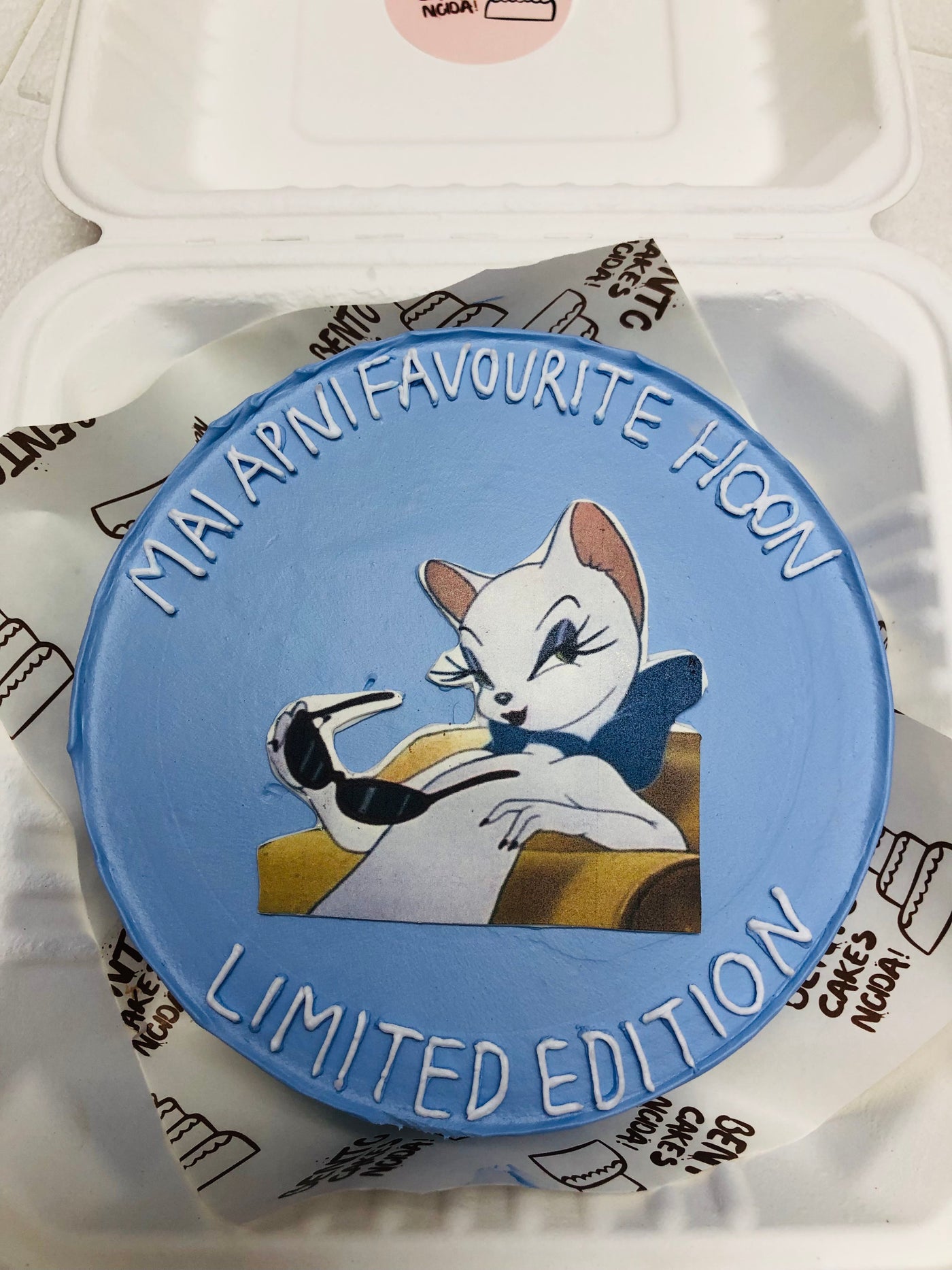Celebrate confidence with this quirky, self-love themed cake featuring a reclining white cat in sunglasses and a blue scarf, lounging on a yellow couch. The edible image is framed by bold white text: “MAI APNI FAVOURITE HOON” and “LIMITED EDITION.” Frosted in light blue and presented in a takeout-style container, this cake is perfect for birthdays, solo celebrations, or gifting someone who owns their vibe unapologetically.