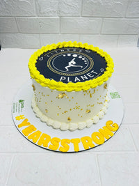 Celebrate strength and progress with this Fitness Planet-themed gym cake, ideal for anniversaries, fitness milestones, or health brand events. The white fondant base is accented with yellow piping and a bold black logo topper featuring a fitness pose. The board reads “#YEARSSTRONG” in yellow, making it perfect for marking years of dedication and transformation.