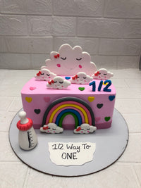 Celebrate baby’s half-birthday with this dreamy pink fondant cake featuring smiling cloud toppers with bows, a fondant rainbow, and colorful heart accents. The number “1/2” is displayed in blue fondant, with the message “1/2 Way to ONE” written on a white plaque. A fondant baby bottle adds a sweet finishing touch, making this cake perfect for milestone drops, baby gifting, or sentimental celebrations that blend softness with playful elegance.