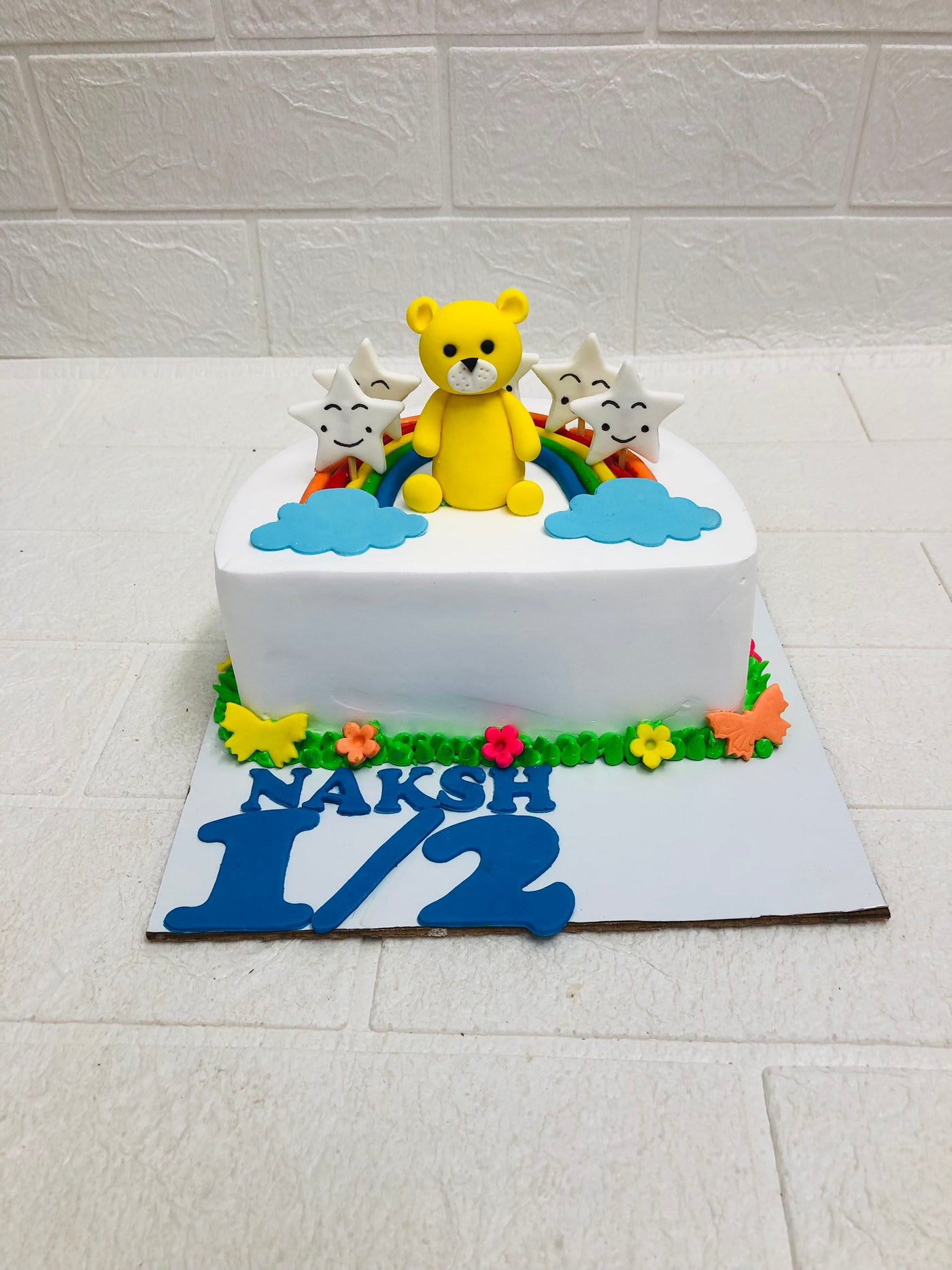 Celebrate Naksh’s half-year milestone with this adorable fondant-decorated cake featuring a white base and playful pastel toppers. A yellow bear sits at the center, flanked by smiling star figures, rainbow arcs, and blue clouds. The base is adorned with colorful fondant flowers and stars, while the message “NAKSH 1/2” is piped in blue on the board. Perfect for baby gifting, milestone drops, or mood-forward uploads with sculpted charm and emotionally sweet storytelling.