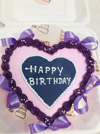 Celebrate with soft charm using this heart-shaped bento cake featuring a pink frosting base and a dark blue heart center with the message “HAPPY BIRTHDAY” written in white icing. The border is decorated with deep purple frosting, white sugar pearls, and delicate purple ribbon bows. Presented in a white takeout-style container with illustrated branding, this cake is perfect for romantic gifting, pastel drops, or mood-forward uploads with elegant flair.