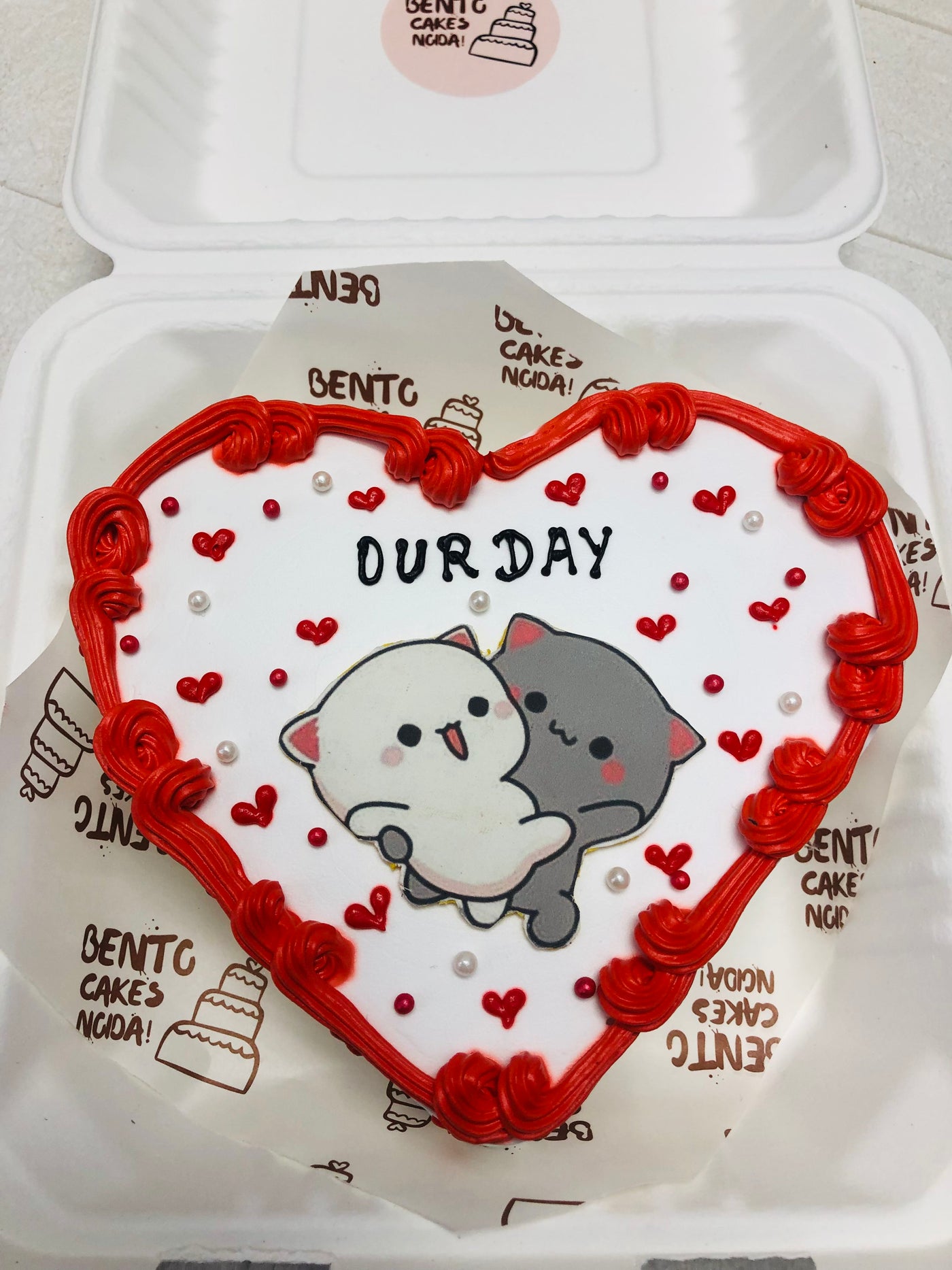 Celebrate love with this cozy bento-style cake featuring a white frosting base and red piped border. The top showcases a cartoon-style illustration of two hugging cats—one white, one gray—surrounded by red heart decorations and white pearl-like embellishments. The message “OUR DAY” is written in bold black icing, making this cake perfect for romantic gifting, couple milestones, or mood-forward drops with emotional softness and pastel charm. Presented in a white takeout-style container with branded liner.