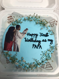 Celebrate a father’s first birthday as “Papa” with this heartfelt bento cake featuring a smooth light blue frosting base and an edible printed image of a family moment—a man in white traditional attire holding a baby, standing beside a woman in red. The message “Happy First Birthday as My Papa” is piped in white icing across the center, surrounded by small white floral accents. Presented in a white takeout-style container with branded liner, this cake blends emotional depth with visual storytelling—perfect for baby gifting, father tribute drops, or uploads that highlight love, memory, and celebration.