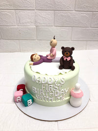 Celebrate a father’s first birthday with his baby using this tender, themed cake featuring fondant figures of a smiling infant in a quilted basket, a seated baby, and a teddy bear with a pink bow. The light green cake is topped with white frosting resembling a soft blanket and decorated with baby blocks (“A”, “B”, “C”), a bottle, and the heartfelt message “DADDY’S FIRST BIRTHDAY WITH ME.” Perfect for new dads, family milestones, or baby-themed gifting.
