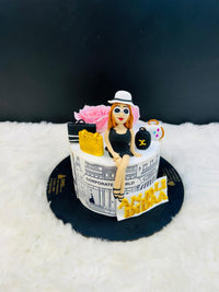 Celebrate success with this corporate-themed birthday cake featuring black cityscape illustrations and the bold “CORPORATE WORLD” label. Topped with pink flowers, luxury-style mini bags, and a figurine in a black dress and white hat, it’s perfect for women in business, entrepreneurs, or anyone who owns their professional journey. Includes a custom name tag: “ANJALI DIDDA.”