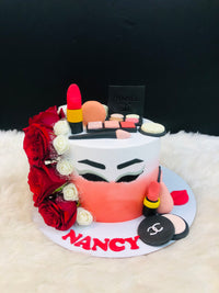 Celebrate beauty-forward spirit with this makeup-themed birthday cake featuring a smooth white base with a soft pink gradient and a stylized face illustration—bold brows, long lashes, and confident flair. The top is adorned with edible makeup elements including lipsticks, blush compacts, and a Chanel-branded eyeshadow palette. Fresh red and white roses add elegance and vibrancy, while the name “NANCY” is piped in bold red letters at the base. Presented on a white circular board against a fur-lined black backdrop, this cake blends fashion-forward styling with sculpted finesse—perfect for birthday gifting, adult uploads, or catalog entries that highlight glamour, personality, and emotional resonance.