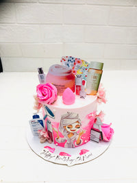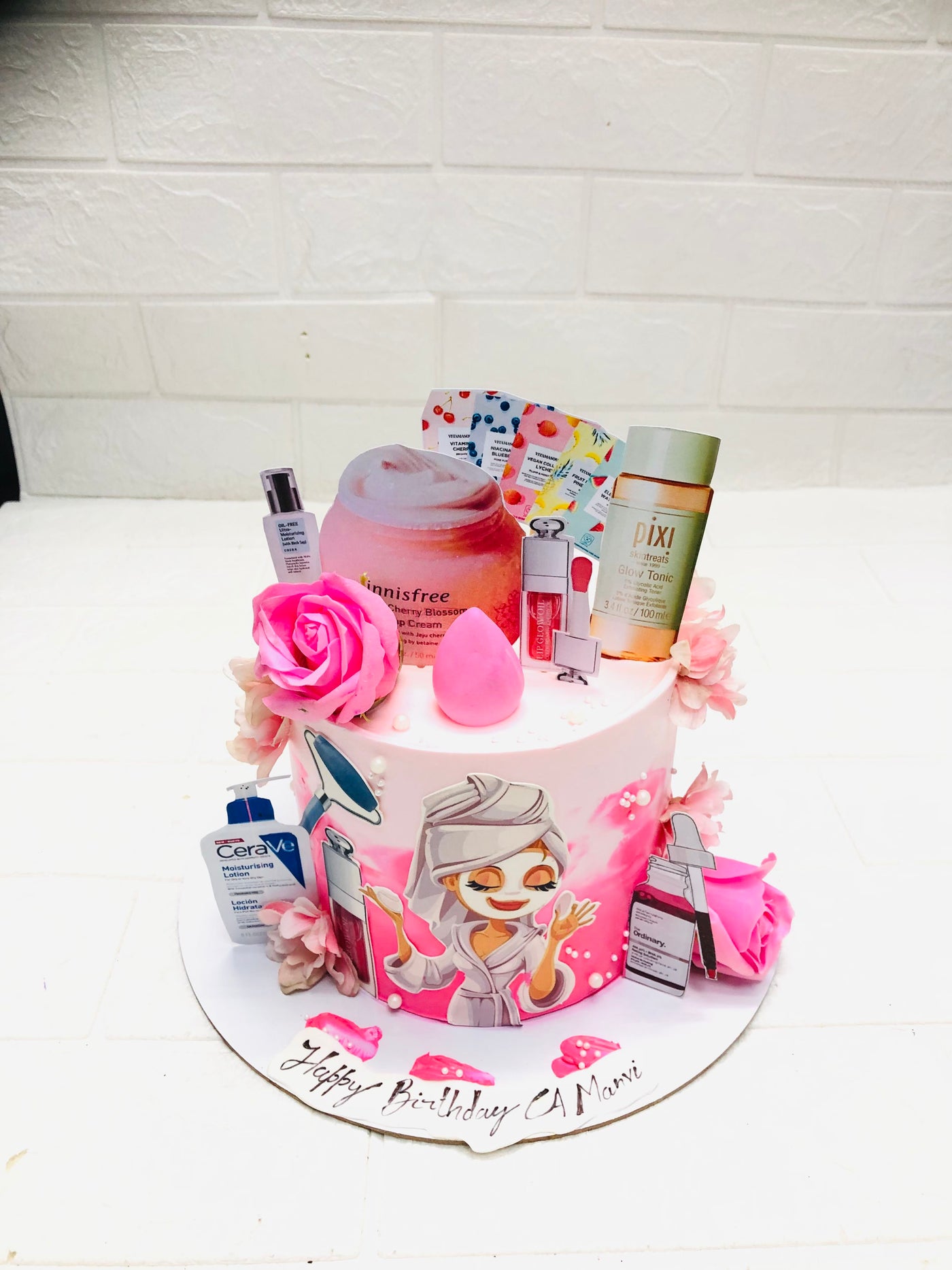 Celebrate CA Mami with this beauty-themed birthday cake featuring miniature fondant replicas of skincare favorites like Innisfree, Pixi, and CeraVe. A cartoon topper shows a woman in a towel and facial mask holding a mirror, surrounded by pink and white flowers, a beauty blender, and product prints. The message “Happy Birthday CA Mami” adds a personal touch, making this cake perfect for skincare enthusiasts, beauty professionals, or self-care queens.