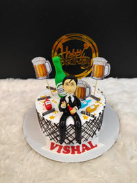 Celebrate in style with our Beer & Whiskey Theme Men's Birthday Cake! Decorated with miniature beer mugs, liquor bottles, and a custom fondant figurine, this fun and unique cake is perfect for party lovers. 100% eggless and freshly baked to order.