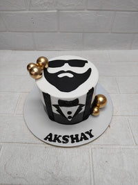 Meet the cake that walks in like it owns the room. “Gentleman Drip” is a tuxedo-inspired showstopper, featuring sleek black suspenders, a bow tie, and buttons down the side. On top, a bold silhouette with sunglasses and a beard adds major attitude, while golden spheres bring a touch of luxe. Personalized with the name “Akshay,” this cake is perfect for birthdays, promotions, or anyone who deserves a little VIP treatment.