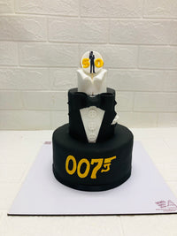 Celebrate a legendary 50th birthday with this two-tier James Bond–themed cake. The bottom tier features a sleek black finish with the iconic gold “007” gun logo, while the top tier mimics a tuxedo with bow tie and buttons. A white topper showcases the silhouette of Bond holding a gun alongside a gold “50,” making this cake ideal for fans of spy films, milestone birthdays, or luxury-themed parties.