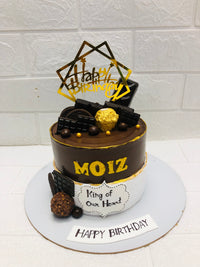 Celebrate Moiz’s birthday with this luxurious two-tone cake featuring a chocolate top layer and a white base with gold accents. Adorned with Ferrero Rocher, Oreo cookies, chocolate bars, and a golden geometric topper reading “Happy Birthday,” this cake also includes heartfelt messages: “King of Our Heart” and “Happy Birthday Moiz.” Perfect for men’s birthdays, chocolate lovers, or personalized celebrations with a royal touch.