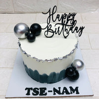 On top of the cake, there are several decorative elements that enhance its visual appeal. Three metallic spheres, in varying sizes, are placed on the left side of the cake. These spheres come in two colors: silver and black, adding a modern and chic touch to the overall design. Additionally, a stylish "Happy Birthday" topper, crafted in an elegant black script font, is positioned prominently on the top of the cake, making the occasion unmistakable.