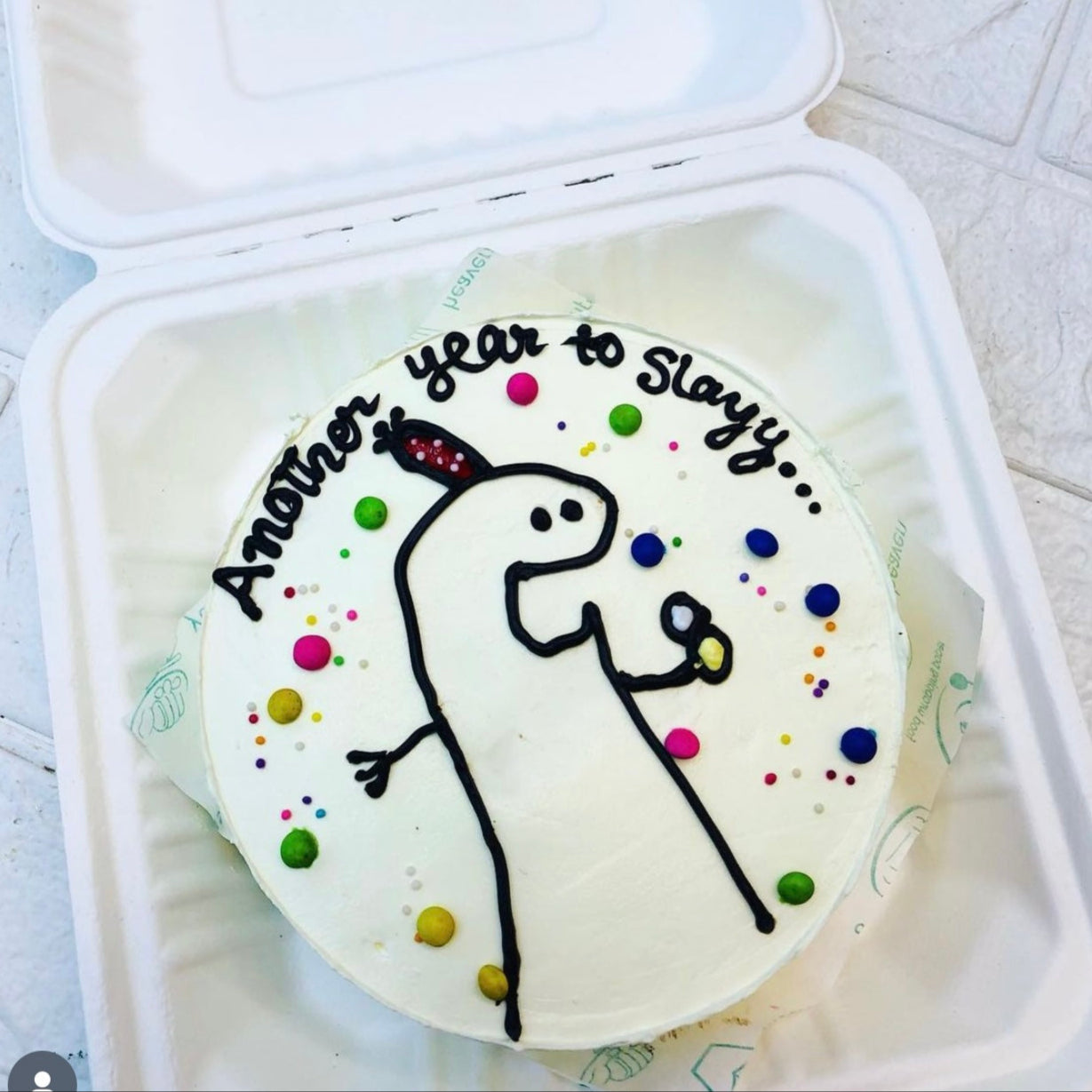 The cake features the cheerful and empowering message "Another year to slay..." written in black icing. This message is perfect for celebrating another year of achievements, growth, and success, making it an ideal choice for birthdays or any other significant milestones.