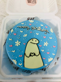 Celebrate with charm through this whimsical birthday cake featuring a light blue fondant base and a cartoon-style character holding a pink heart. White cursive icing spells out “Happy Birthday” above the figure, anchoring the tribute with warmth and affection. Decorative flower-shaped icing in white and pink, along with scattered white dots resembling confetti or stars, add texture and playfulness. Presented inside a white takeout-style container with branded parchment, this cake blends visual storytelling with minimalist finesse—perfect for romantic gifting, nickname uploads, or catalog entries that highlight sweetness, personality, and emotional clarity.
