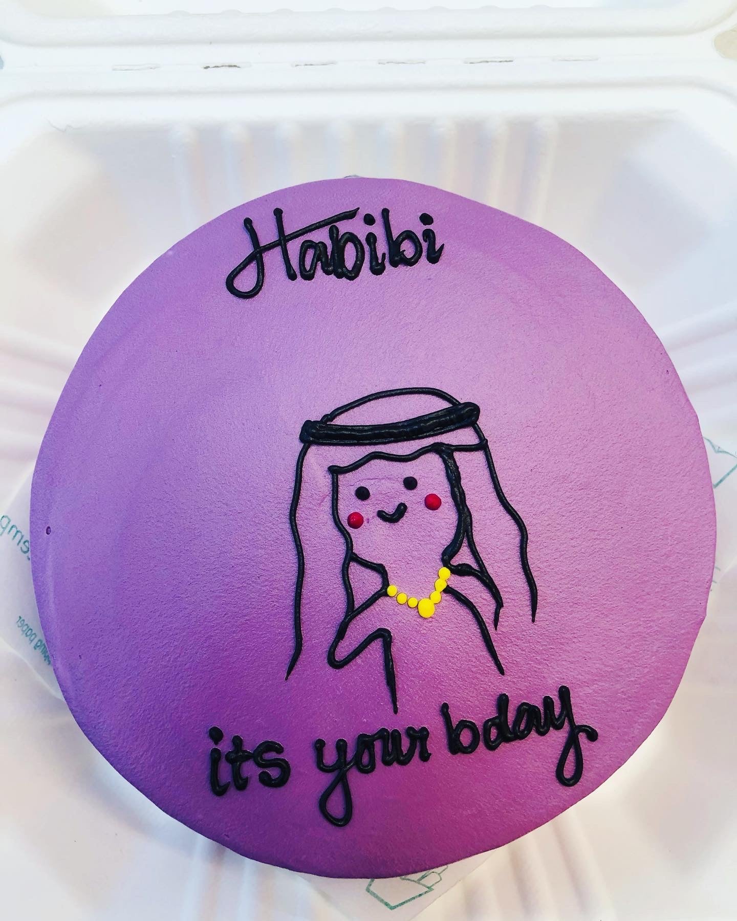 The cake's design is minimalistic yet charming. At the top of the cake, the word "Habibi" is written in black icing. "Habibi" is an Arabic term of endearment that translates to "my love" or "my dear" in English, making this cake a heartfelt gesture for a loved one's birthday.