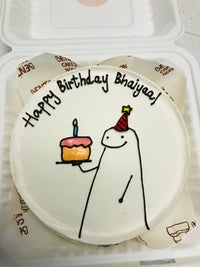 Celebrate Bhaiyael’s birthday with this whimsical bento cake featuring a smooth white frosting base and a cartoon-style character wearing a red party hat with a yellow star, holding a pink cake topped with a lit blue candle. The message “Happy Birthday Bhaiyael” is piped in black icing across the top, blending sibling warmth with playful charm. Presented in a white takeout-style container with branded liner, this cake is perfect for brother gifting, tribute drops, or uploads that highlight joy, personality, and celebration.