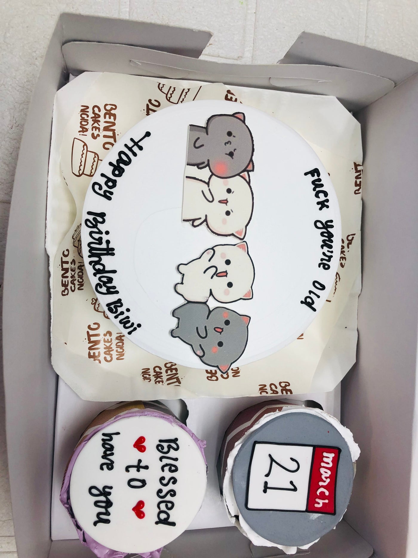 Celebrate Jiwji’s birthday with this playful and cheeky cake set featuring a round cake decorated with cartoon-style stacked animals—possibly cats or dogs—alongside the bold message “Fuck you’re old” and “Happy Birthday Jiwji” written in black icing. The set includes two themed cupcakes: one with a calendar topper showing “21 March” and the other with the message “Blessed to ♥ have you.” Presented in a white box with branded liner, this combo is perfect for milestone gifting, humor-forward drops, or mood uploads with emotional depth and character charm.
