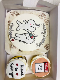 CCelebrate love and shared memories with this adorable birthday cake and cupcake set. The main cake features two cartoon bunny characters—one lovingly feeding the other—alongside the message “Happy birthday Husband” with red heart accents. Paired with two fondant cupcakes: one reads “Blessed to have you” and the other displays a calendar marking August 23. Perfect for romantic birthday surprises, anniversary tributes, or custom couple-themed celebrations.