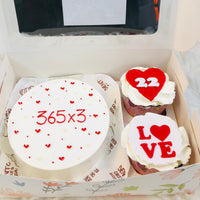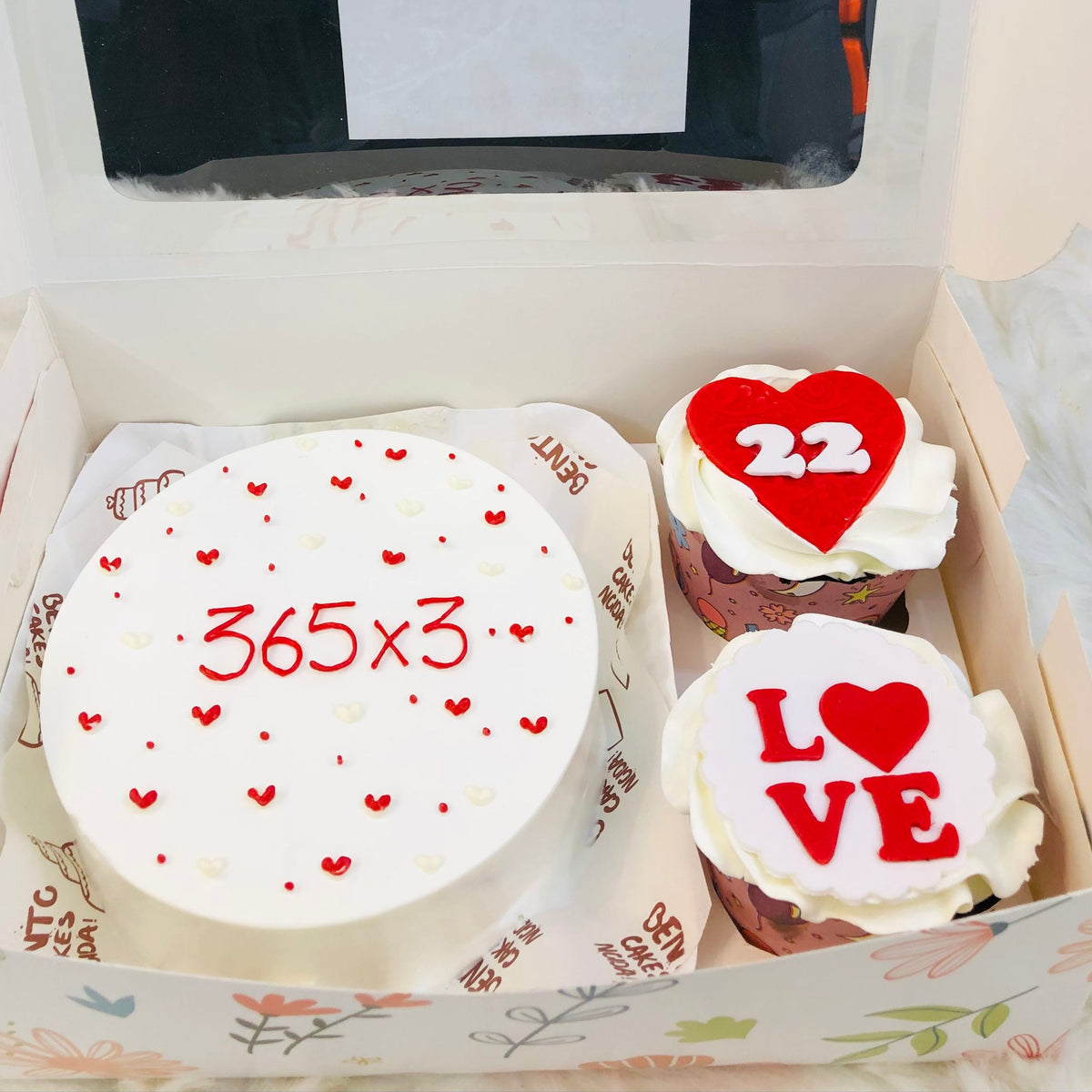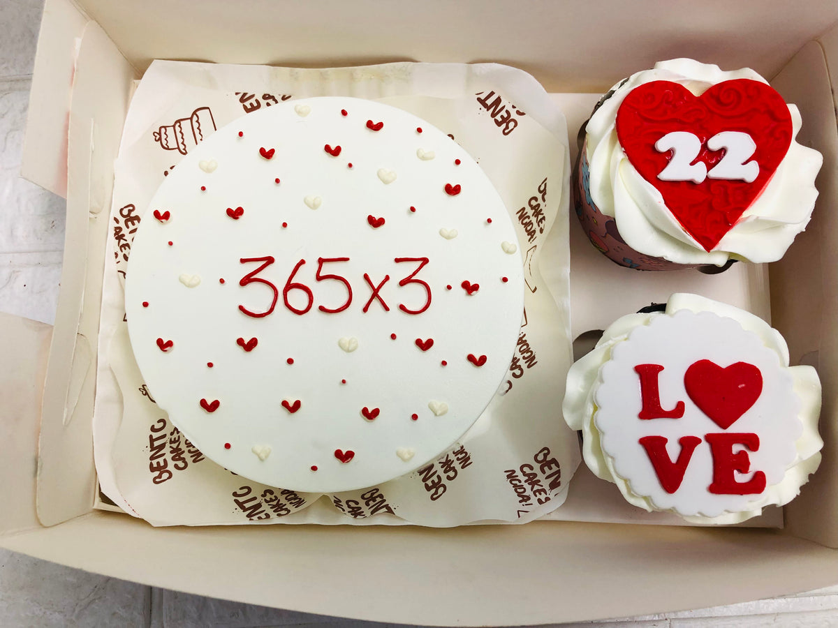 The centerpiece of this set is a round cake with smooth white frosting. The cake is adorned with small red and white heart decorations, adding a touch of elegance and romance. The text "365 x 3" is written in bold red icing, making it a unique and intriguing focal point. This cake is perfect for anniversaries, birthdays, or any special celebration that spans three years of love and commitment.