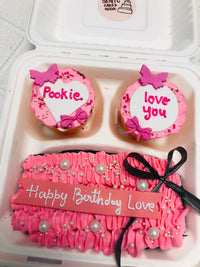 Celebrate with sweetness and sentiment using this romantic bento cake trio featuring two round cakes and one rectangular centerpiece. The round cakes are topped with white fondant and pink messages—“Pookie” and “Love You”—adorned with butterfly decorations and sprinkles. The rectangular cake is piped with pink ruffled frosting, white pearls, and a black ribbon bow, with a fondant banner reading “Happy Birthday Love.” Presented in a white takeout-style box with branded liner, this set is perfect for nickname gifting, romantic drops, or mood-forward uploads with pastel charm and emotional warmth.