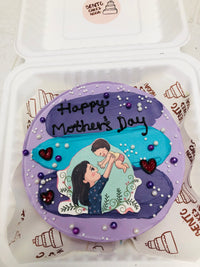 Celebrate Mom with this heartfelt bento cake featuring a smooth purple frosting base and a central illustration of a joyful mother lifting her baby in the air, surrounded by love. Red heart-shaped embellishments, white and purple pearls, and soft floral accents add texture and charm. The message “Happy Mother’s Day” is piped in black icing across the top, blending emotional depth with visual elegance. Presented in a white takeout-style container with branded liner, this cake is perfect for Mother’s Day gifting, tribute drops, or uploads that highlight love, gratitude, and maternal connection.