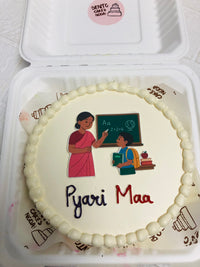 Celebrate a mother’s love and wisdom with this tribute cake featuring a smooth white frosting base and a border of elegant dollops. The top showcases a cartoon-style illustration of a woman teaching a child beside a chalkboard with “Aa” and “2 + 2 = 4” written on it. The child holds a book next to a stack of books, while the woman points at the board. Below the scene, “Pyari Maa” is piped in colorful icing—blue for “Pyari” and red for “Maa.” A heartfelt choice for birthdays, Mother’s Day, or teacher appreciation.