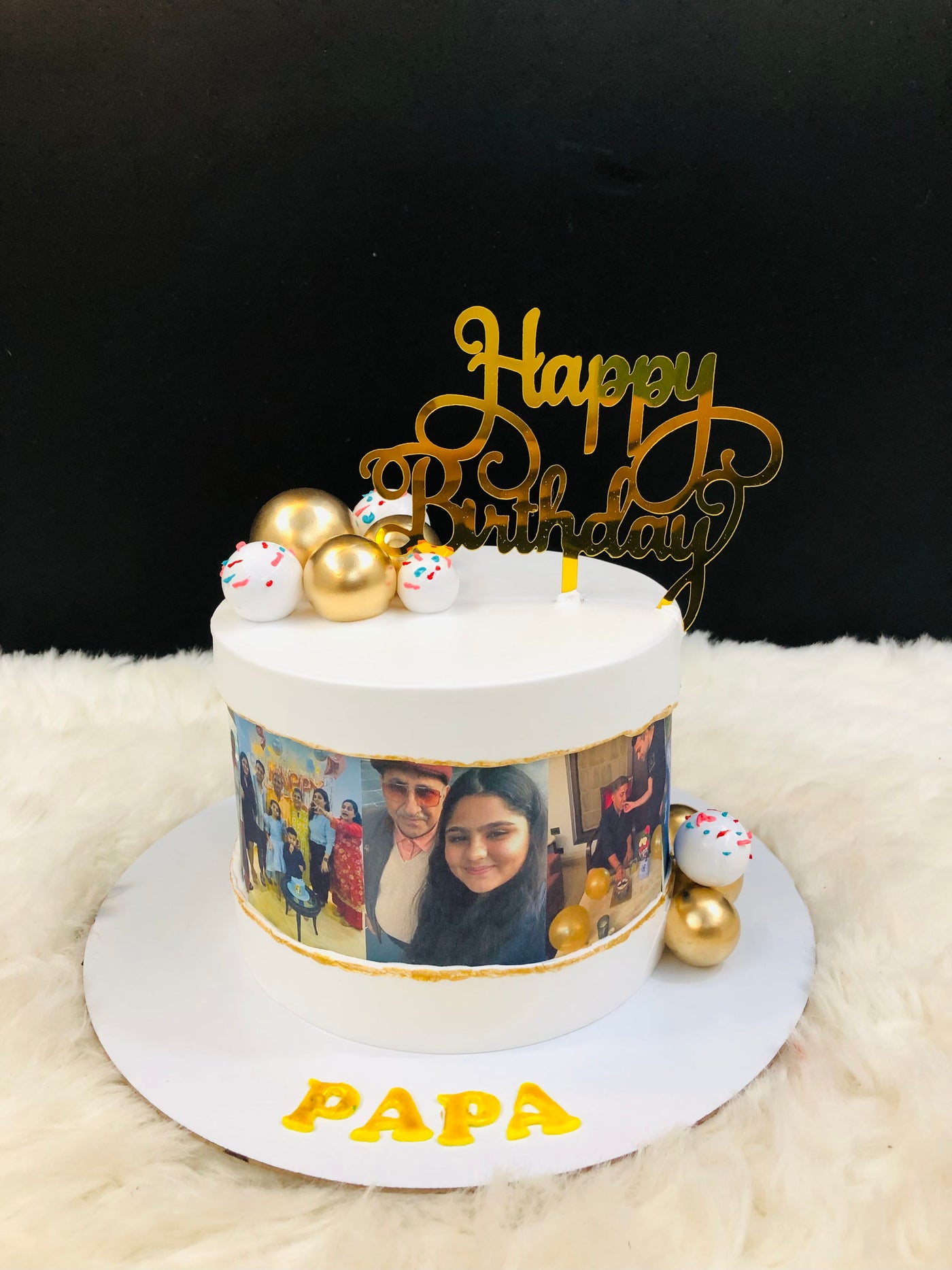 Celebrate Papa’s special day with this elegant and heartfelt birthday cake featuring a smooth white frosting base and metallic gold spherical accents. A golden “Happy Birthday” topper crowns the celebration, while red-sprinkled white spheres add texture and charm. The highlight is a printed edible photo collage wrapped around the cake, showcasing cherished moments and personal connections. The word “PAPA” is piped in bold yellow icing on the white circular board, anchoring the tribute with warmth and pride. Presented on a soft fur base against a black backdrop, this cake blends visual storytelling with sculpted finesse—perfect for birthday gifting, adult uploads, or catalog entries that highlight personalization, emotion, and elegance.
