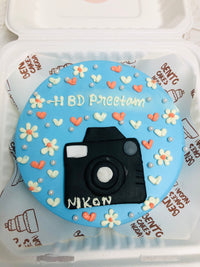 Celebrate Preetham’s love for photography with this custom birthday cake featuring a light blue fondant base and a sculpted black Nikon camera with white lens and button detailing. The cake is adorned with small pink and white flowers, pastel hearts, and the message “HBD Preetham” piped in white. Presented inside a white takeout-style box with branded “CENTIC CAKES” lining, this design blends hobby tribute with soft elegance—perfect for birthday gifting, themed uploads, or catalog entries that highlight personality, passion, and emotional connection.