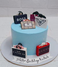 Celebrate in style with this powder blue birthday cake topped with miniature shopping bags from iconic fashion brands: BOSS, VALENTINO, PRADA, BURBERRY, COACH, and GUCCI. Each bag is detailed with logos and handles, creating a luxe, fashion-themed centerpiece. A white plaque with “Happy Birthday Kashish” adds a personal touch.