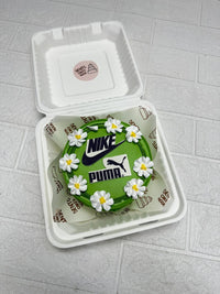 Celebrate your love for iconic sportswear with this green-frosted bento cake featuring both the Nike and Puma logos. Decorated with white and yellow floral icing, the cake playfully contrasts the black Nike swoosh with the white Puma silhouette. Packaged in a white takeout-style box with “CAKE SQUARE” branded wax paper, it’s ideal for sneakerheads, gym lovers, or brand enthusiasts looking for a fun and flavorful twist.