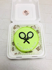 Celebrate Arijit’s love for tennis with this sporty bento cake featuring a vibrant lime green frosting base and two fondant tennis rackets crossed at the center—detailed with black frames, white strings, and red handles. The message “Happy Birthday Arijit” is piped in white cursive icing below the rackets, surrounded by minimalist accents. Presented in a white takeout-style container with branded liner, this cake blends athletic charm with personalized finesse—perfect for sports gifting, tribute drops, or uploads that highlight hobbies, personality, and celebration.