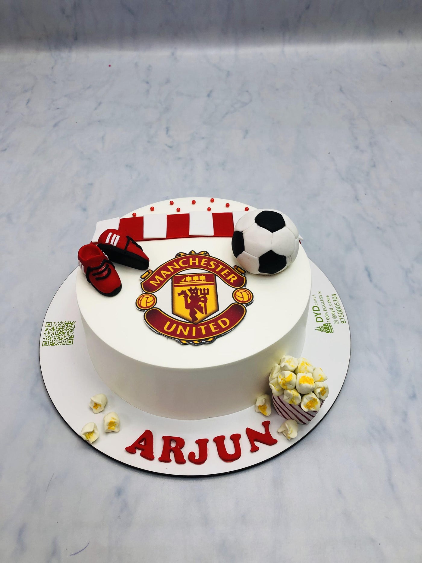 As a product expert, I present the Manchester Team Theme Cake. Celebrate your love for Manchester with this delicious cake, featuring the iconic team's colors and logo. Made with high-quality ingredients, this cake is perfect for any Manchester fan's special occasion. Order now and indulge in a mouthwatering treat!