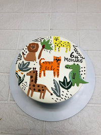 Celebrate six months of joy with this vibrant jungle-themed cake featuring a red lower tier and white upper section adorned with playful animal illustrations. Lions, giraffes, tigers, crocodiles, and cheetahs gather around leafy accents and abstract shapes, creating a lively safari scene. The message “6 months” is piped in bold black icing on top, anchoring the milestone with clarity and affection. Presented on a white circular board against a tiled backdrop, this cake blends character-forward styling with sculpted finesse—perfect for baby gifting, milestone uploads, or catalog entries that highlight growth, imagination, and emotional warmth.