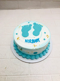 Celebrate baby Nirbhay with this charming round cake featuring a smooth white and light blue frosting base, topped with two large fondant footprints and golden sprinkles. The name “NIRBHAY” is written in bold blue letters, surrounded by soft piped borders and dotted accents. Perfect for baby showers, naming ceremonies, or milestone gifting that blends emotional warmth with clean, elegant presentation.