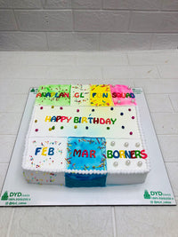 Celebrate with a splash of color and community using this rectangular birthday cake designed as a 3x3 grid. Each square features a unique message or tag—“ANA PLAN,” “GL,” “FUN SQUAD,” “FEB,” “MAR,” and “BORNERS”—surrounding a central “HAPPY BIRTHDAY” block in multicolored letters. Decorated with confetti, pearls, and playful typography, this cake is perfect for group celebrations, themed parties, or gifting drops with insider warmth and modular flair.