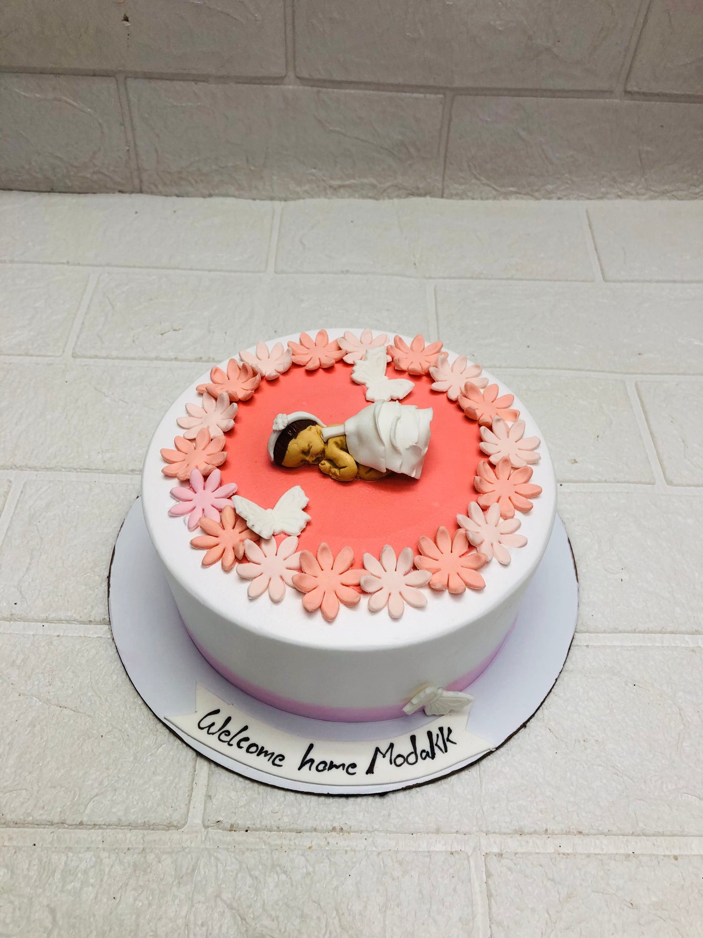 Celebrate baby Modakk’s homecoming with this tender oval cake featuring a smooth white fondant base and a pink circular topper. At the center lies a fondant baby wrapped in a white blanket, wearing a headband and surrounded by pink and white floral accents. Two white doves add a symbolic touch of peace and purity. The message “Welcome home Modakk” is written in black icing, making this cake perfect for newborn celebrations, naming ceremonies, or heartfelt gifting.