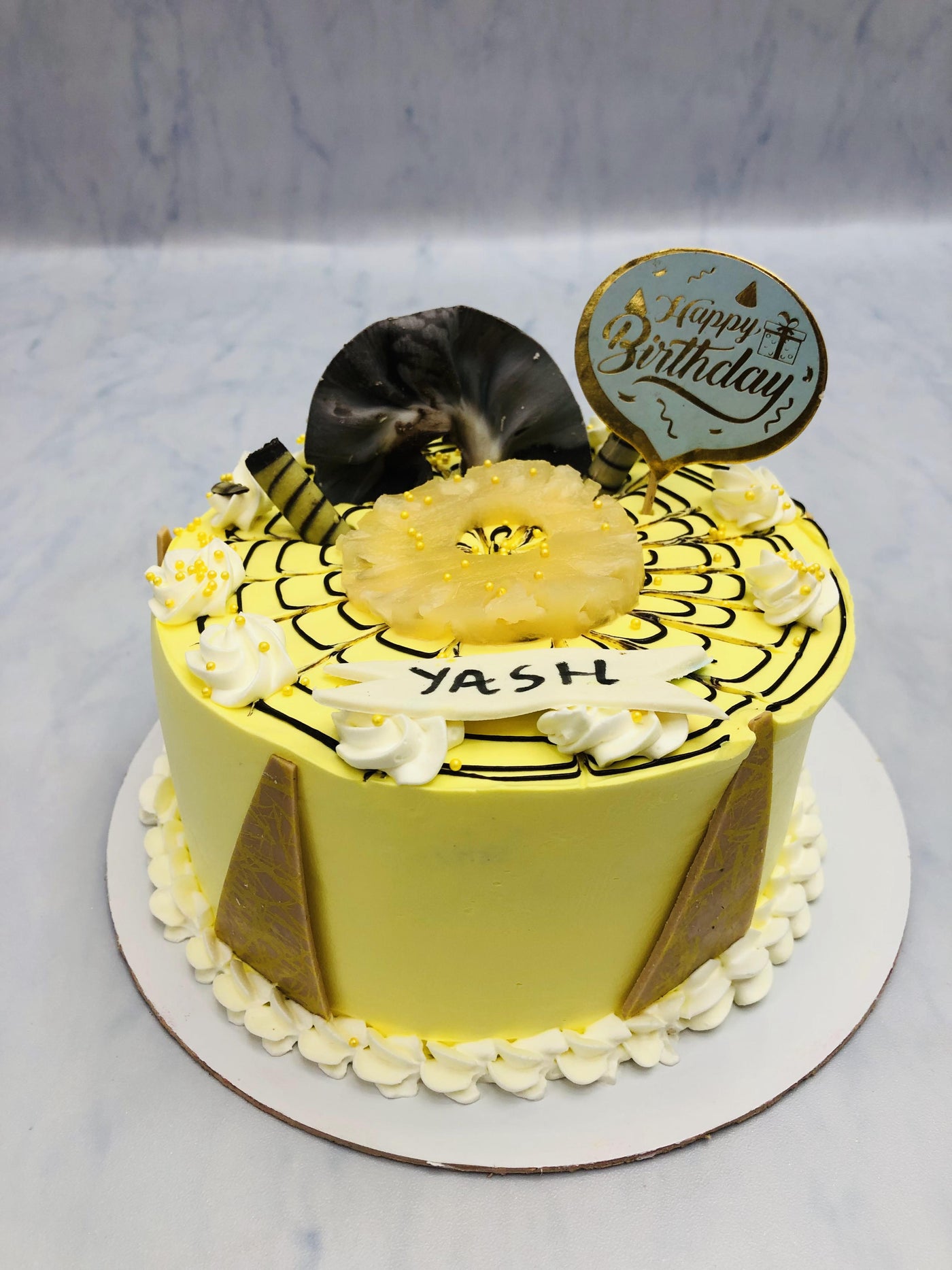 Fruit Decor in the picture are subject to availability and seasonality. Indulge in a tropical paradise with our Pineapple Theme Cake! Made with real pineapple and decorated with intricate details, this cake is sure to be the centerpiece of any party. Enjoy the delicious taste and visually stunning design, all in one delightful dessert. Perfect for any occasion - birthdays, weddings, or just a sweet treat for yourself.